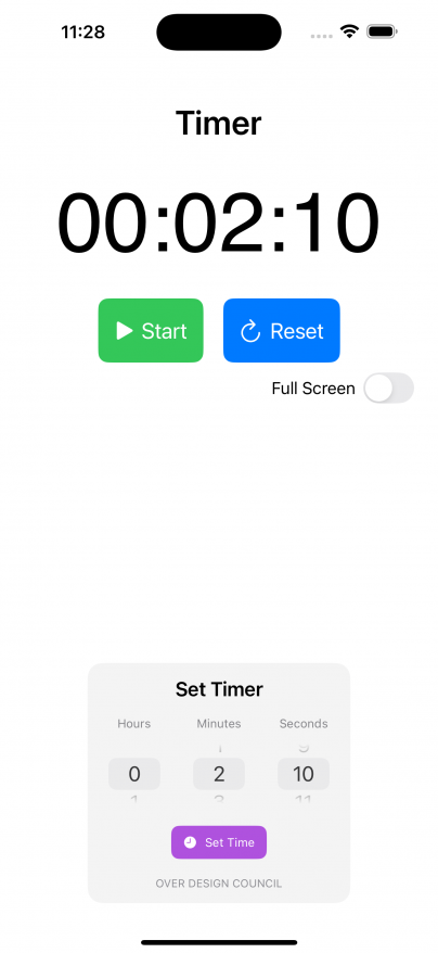 The full screen button shows a large format timer in full screen mode.